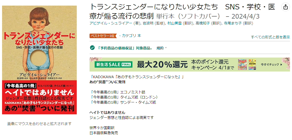 『トランスジェンダーになりたい少女たち』がアマゾンで本の売れ筋ランキング総合1位になりました。 皆様、本当にありがとうございます。