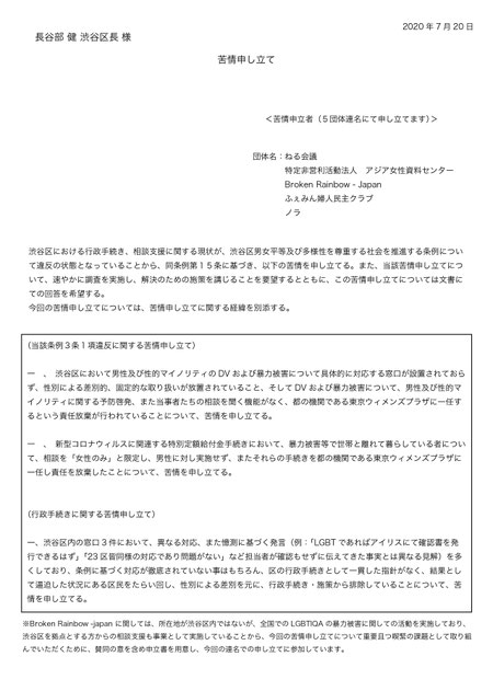 渋谷区における行政手続き、相談支援に関する現状が、渋谷区男女平等及び多様性を尊重する社会を推進する条例について違反の状態となっていることから、同条例第15条に基づき、以下の苦情を申し立てました。また、当該苦情申し立てについて、速やかに調査を実施し、解決のための施策を講じることを要望しました。