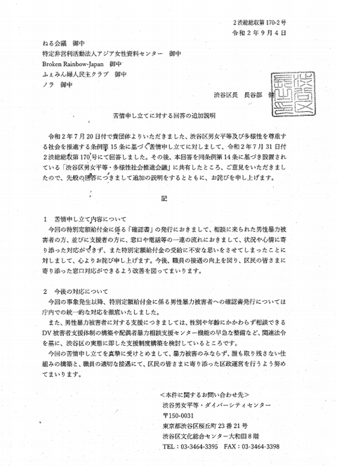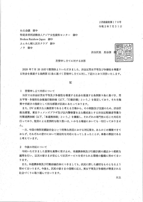 回答に際し、当会からの問い合わせに我々が提出した苦情申し立ての経緯について、渋谷区としてこれらは全て現実に起きたことだと確認出来た旨、ご確認いただきました。