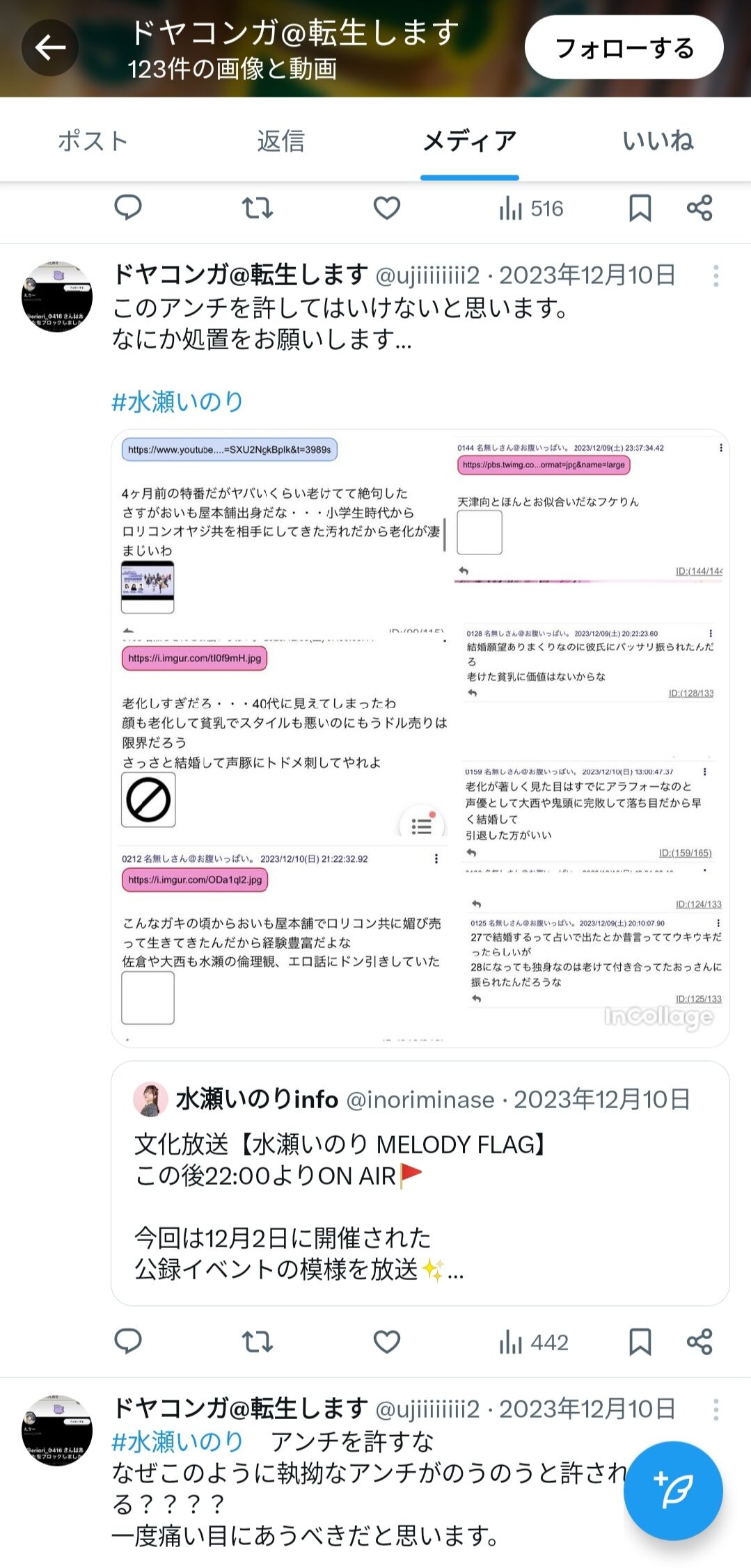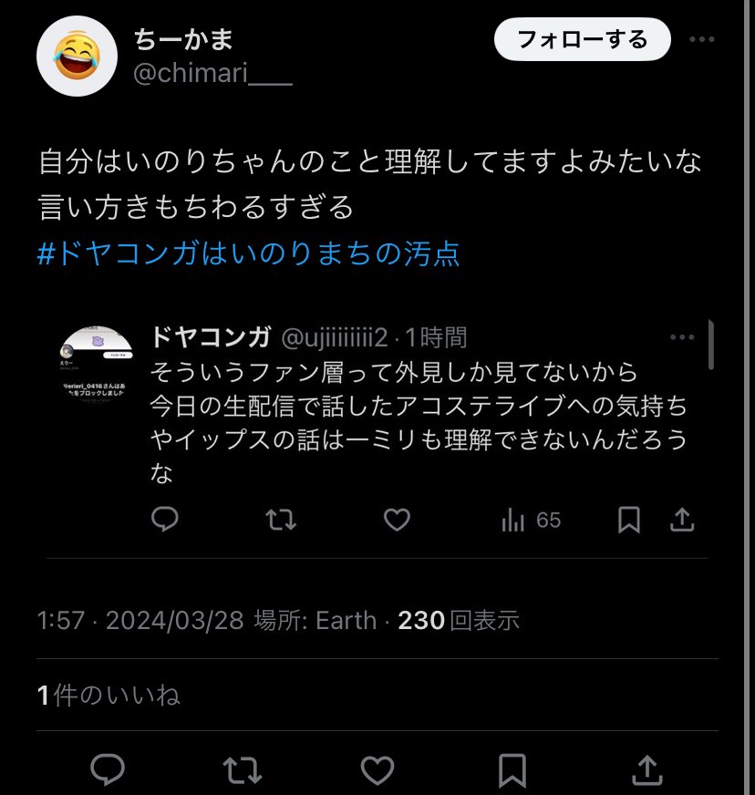 - これが仮にいのりのファンやったとしても、水瀬いのりのライブに行きましたとか言うツイートがないのがふしぎで仕方ない。ここまで詳しいなら1回ぐらいライブに行ってるはずやし、それをツイートしてもいいと思う。そしてこの方と塩化してる人がいてもおかしくないんよねーーーー これが水瀬いのりのファンなら