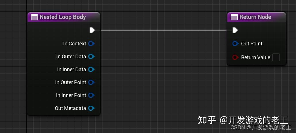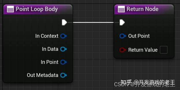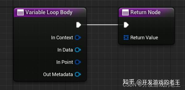 FPCGAsync::AsyncPointProcessing和FPCGAsync::AsyncMultiPointProcessing都是异步的,它们的区别就在于处理输入:输出为1:1还是1:N的循环。Point Loop Body和VariableLoopBody,前者输入一个point返回一个point;后者输入一个point可以返回一个point的数组。比如:如果你想把一个point看作一块地基,想在它的垂直上方再生成一串点作为楼层,然后把这些点返回,那么你就需要用到VariableLoopBody。