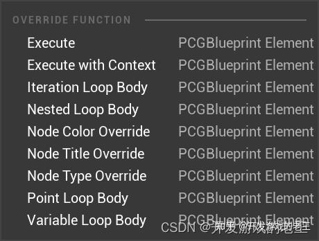 UPCGBlueprintElement是PCGGraph中自定义节点的基类,但官方目前还没有给出详细的文档,所以从源代码里找点答案。可覆盖函数(Override Functions)