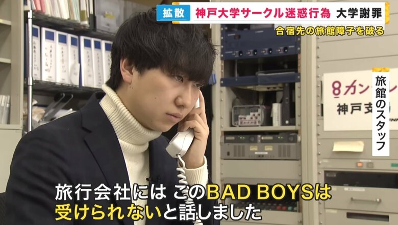 サークルが5年前に宿泊した旅館のスタッフ:無理やりお酒を飲ませて吐くとか、あとお部屋に備え付けのシャンプーを廊下に撒き散らしたりとか、クローゼットの中に落書きをされてしまったりとか。お花を飾る花瓶の中にタバスコが入っていたりとか。ここまでひどいサークルはなかったですね。旅行会社にはこの『BADBOYS』は受けられないと話しました。