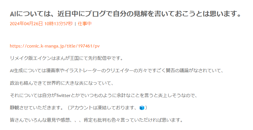 AI生成については漫画家やイラストレーターのクリエイターの方々ですごく賛否の議論がなされていて、