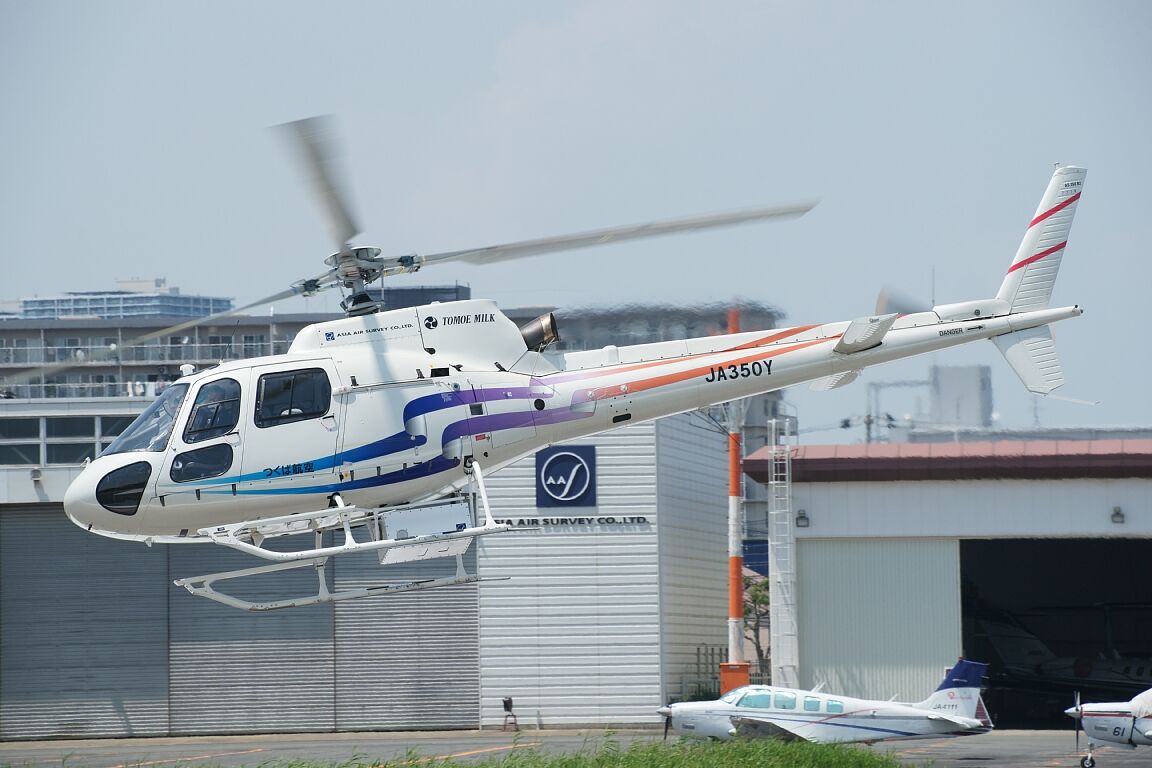 こちらも外来機だが、ミッションで八尾をベースに飛んでいることがあるので珍しさは少ないつくば航空のJA350Y。測量機器をぶら下げて昼頃に離陸していったが、もともとはつくばヘリポートを定置場としている機体。アジア航測のミッションを行っている関係で機体には「アジア航測」の表記と運航元の「つくば航空」、その親会社の「トモエ乳業」と3社の表記がされている。