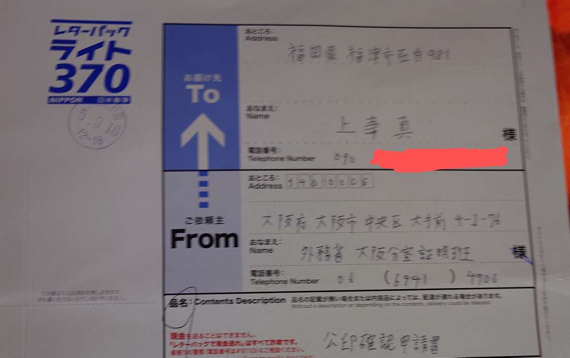 労働ビザ申請のため外務省から頂いた公印