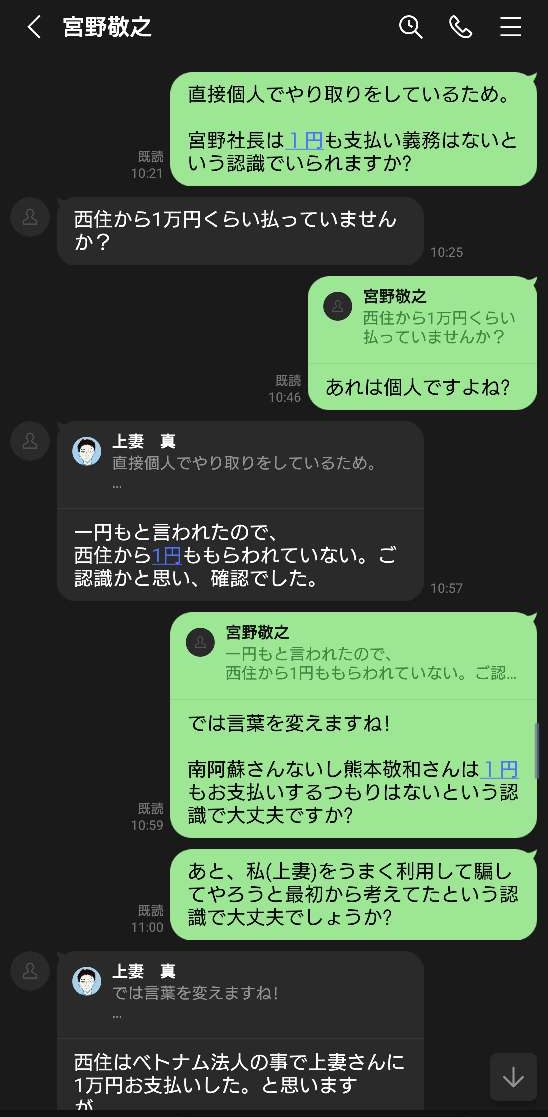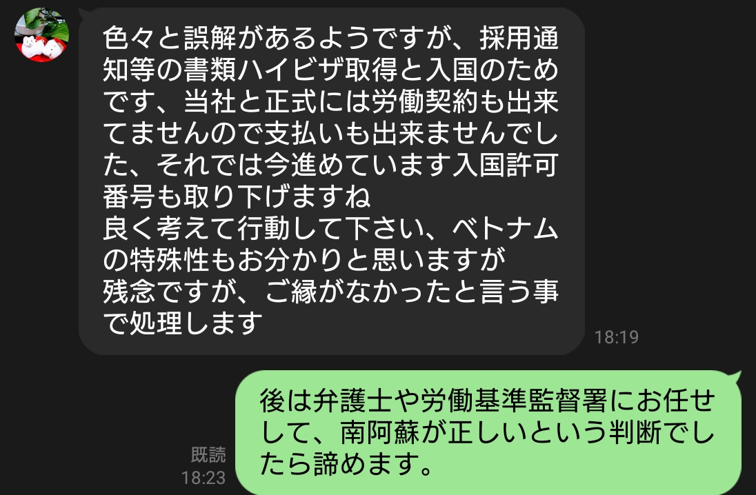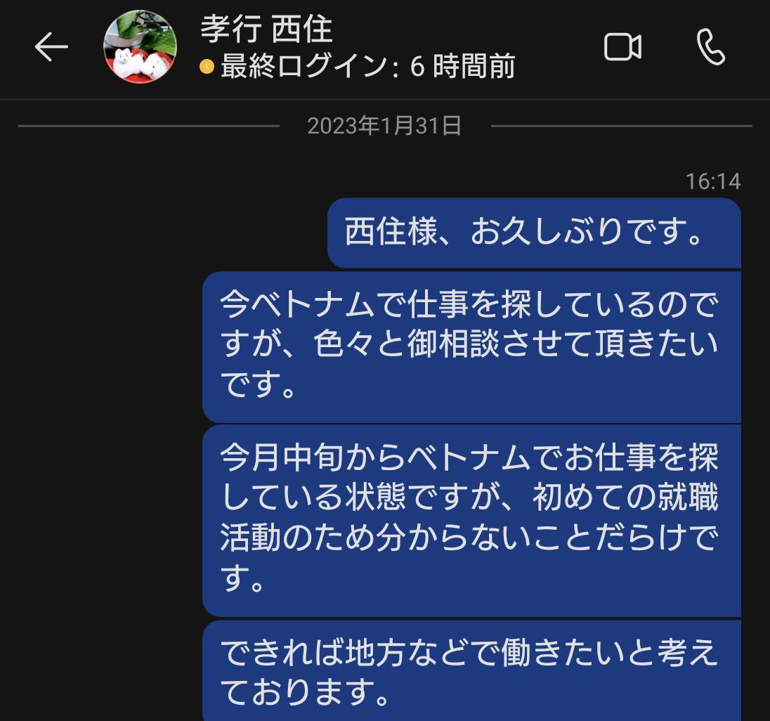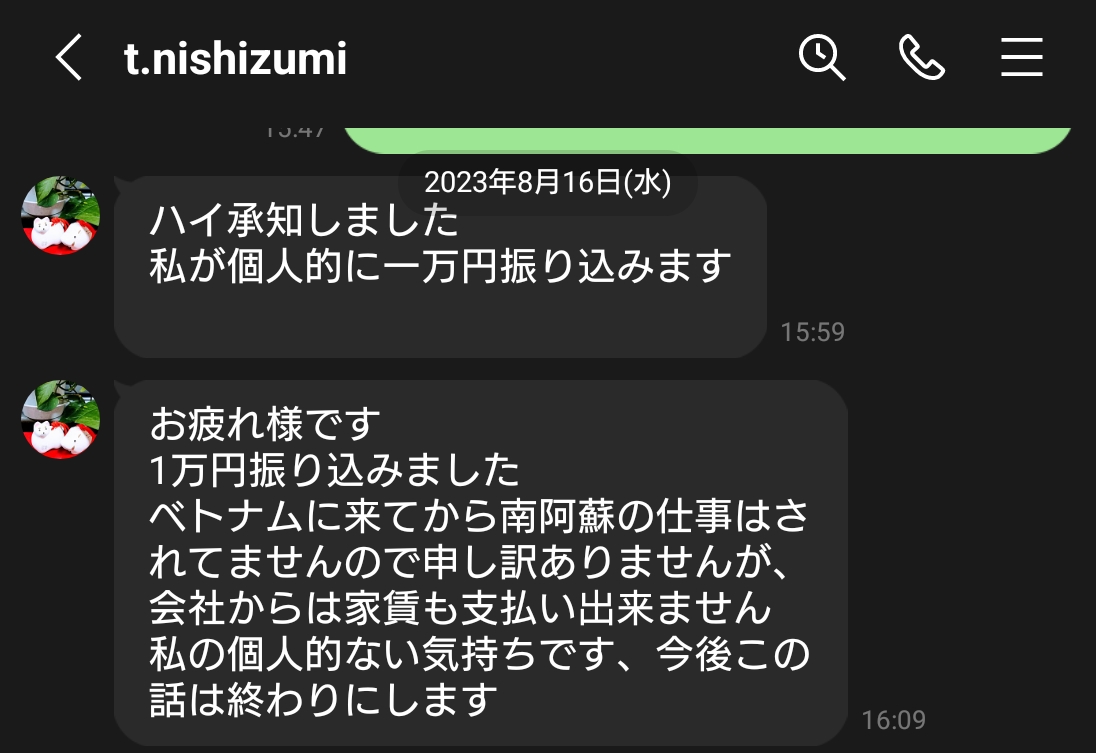 私は本当にベトナム就職を考えて、西住さんに相談をしました。後出しジャンケンで、給与も払わず、8ヶ月も人の時間を奪っておいてどの口が偉そうに言えるのでしょうか?