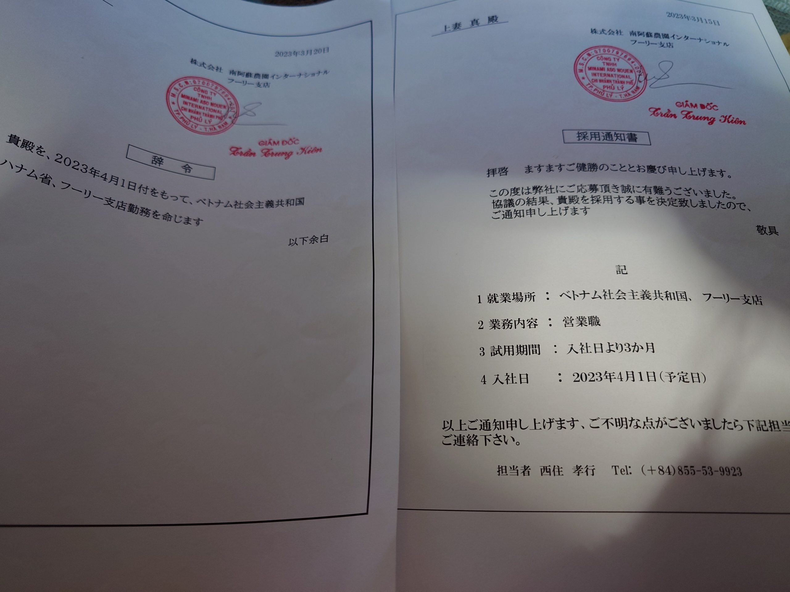そして3月にはクマモト敬和さんから採用通知書とベトナム出向辞令を頂きました。