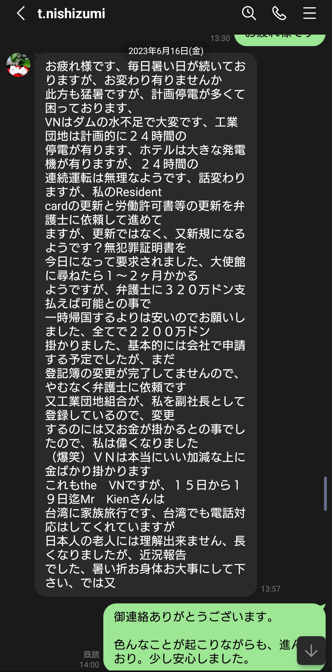西住さんはお客様だったし、これまでのやり取りから、変な方ではないと思い。西住さんを信じて出張ビザでベトナムへ渡航することにしました。