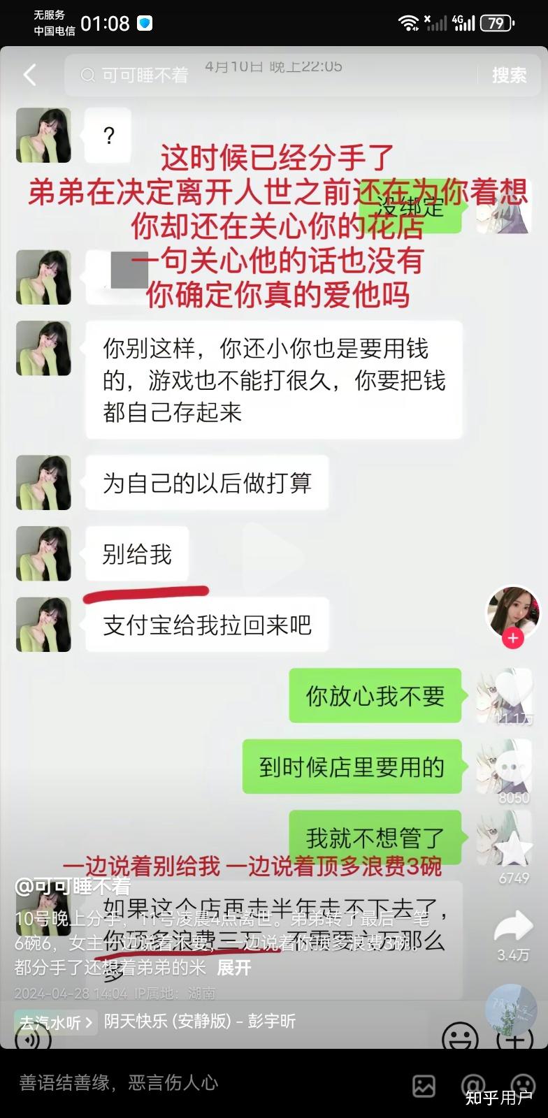 也解释了为什么她在弟弟去世后的这段时间在qq和微信给弟弟发他已经看不到的消息而不是更早的聊天记录,因为她拿不出来,以前的只言片语比如她让弟弟把钱给她存着别被人骗了的作品已经删了,无论是p的图还是真的,也都代表了他们之前几年的来往很少,我甚至都没发现那个作品什么时候删的
