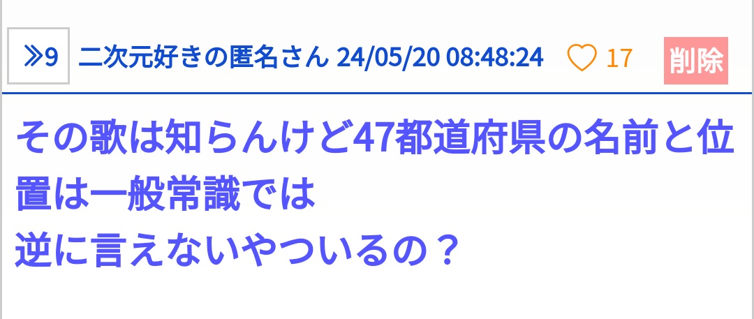 馬鹿にされた!47都道府県の位置覚えてないのは普通の事!馬鹿にする方がおかしい!とか言い出すのはただのあたおかなんよ - 42二次元好きの匿名さん24/05/20(月) 11:19:55