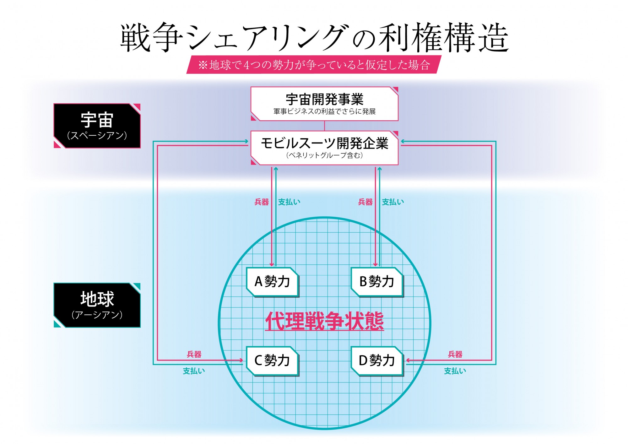 実際はなんか金儲けメインで、地球はそんなに豊かではない、資源があるか不明なのに兵器を購入してアーシアン勢力同士で争ってその利益でスペーシアン側の企業が儲けているという奇妙な設定になっている - 126二次元好きの匿名さん24/05/20(月) 18:00:13