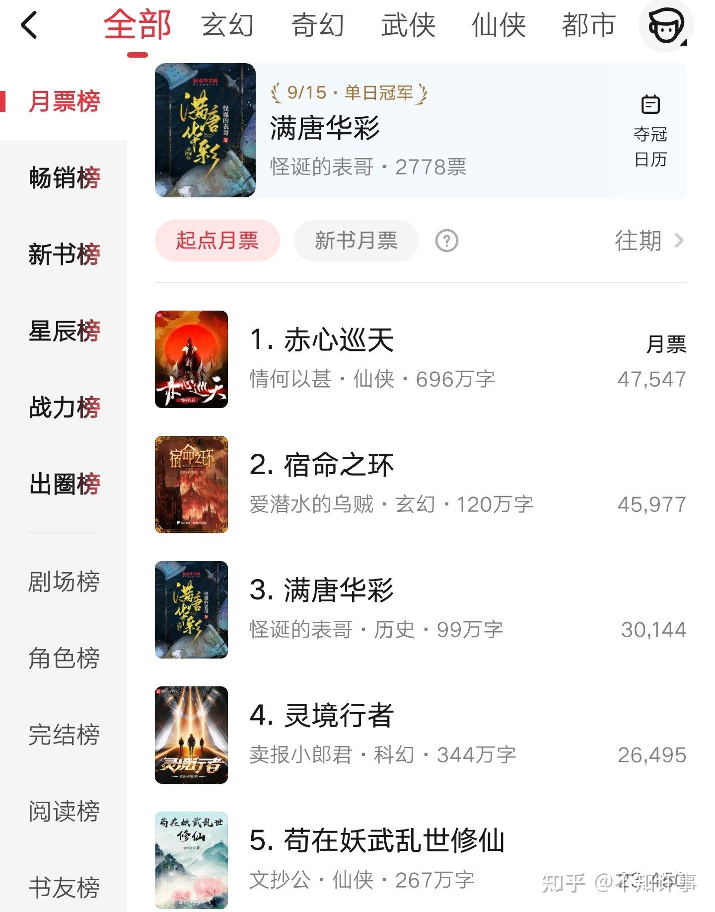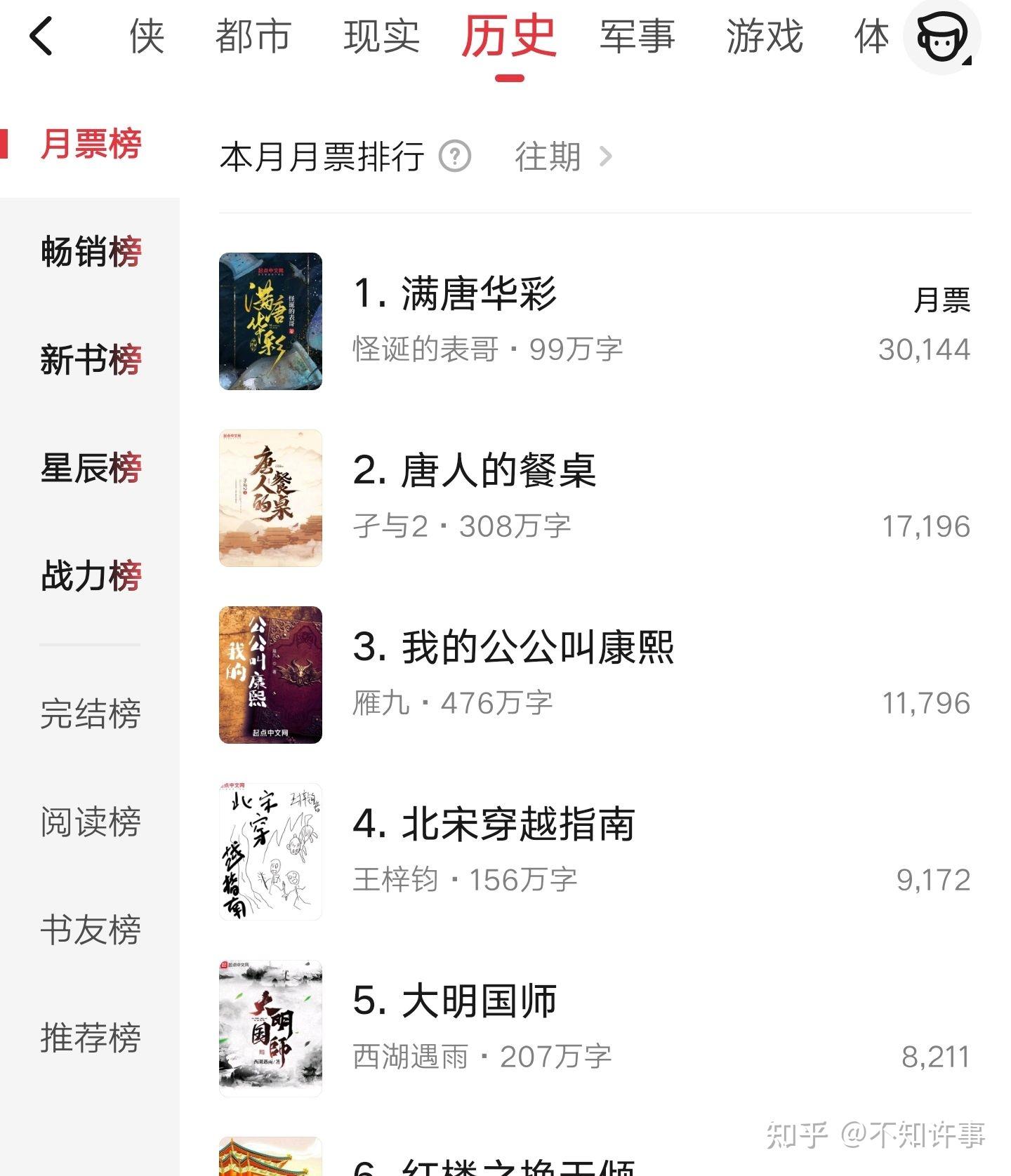9月16日起点排行榜(图1、2)显示:位列月票总榜第3,历史分类第1,夺得单日冠军。可谓是起点历史分类的现象级作品了,本人非常喜欢,心目中的历史穿越文第一梯队。