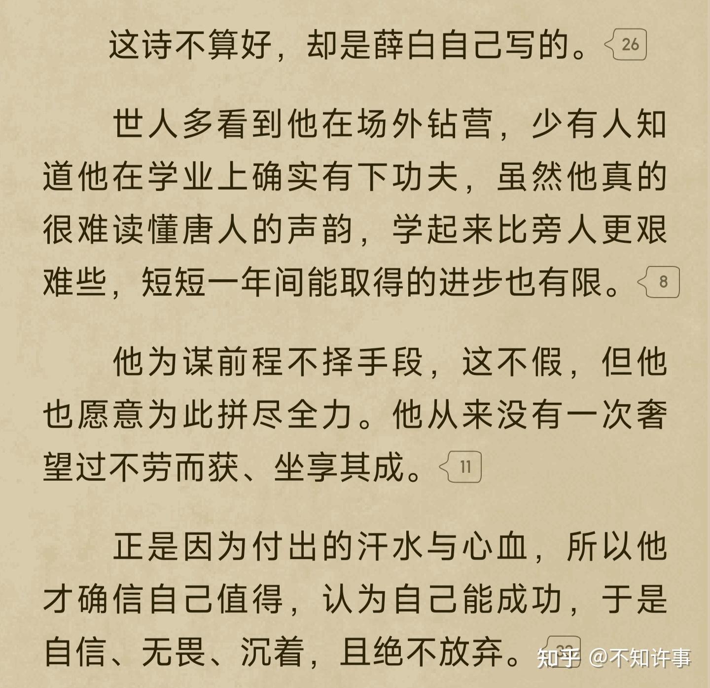 (4)天道酬勤的认真:全文看下来,绝对是下了功夫的,作者一以贯之的坚韧,收集资料,考据细节,斟酌文理,至科举一章(图9),仿佛听见了作者的心声,不断地积累和砥砺,造就今日的薛白和作者,我是非常赞叹的。