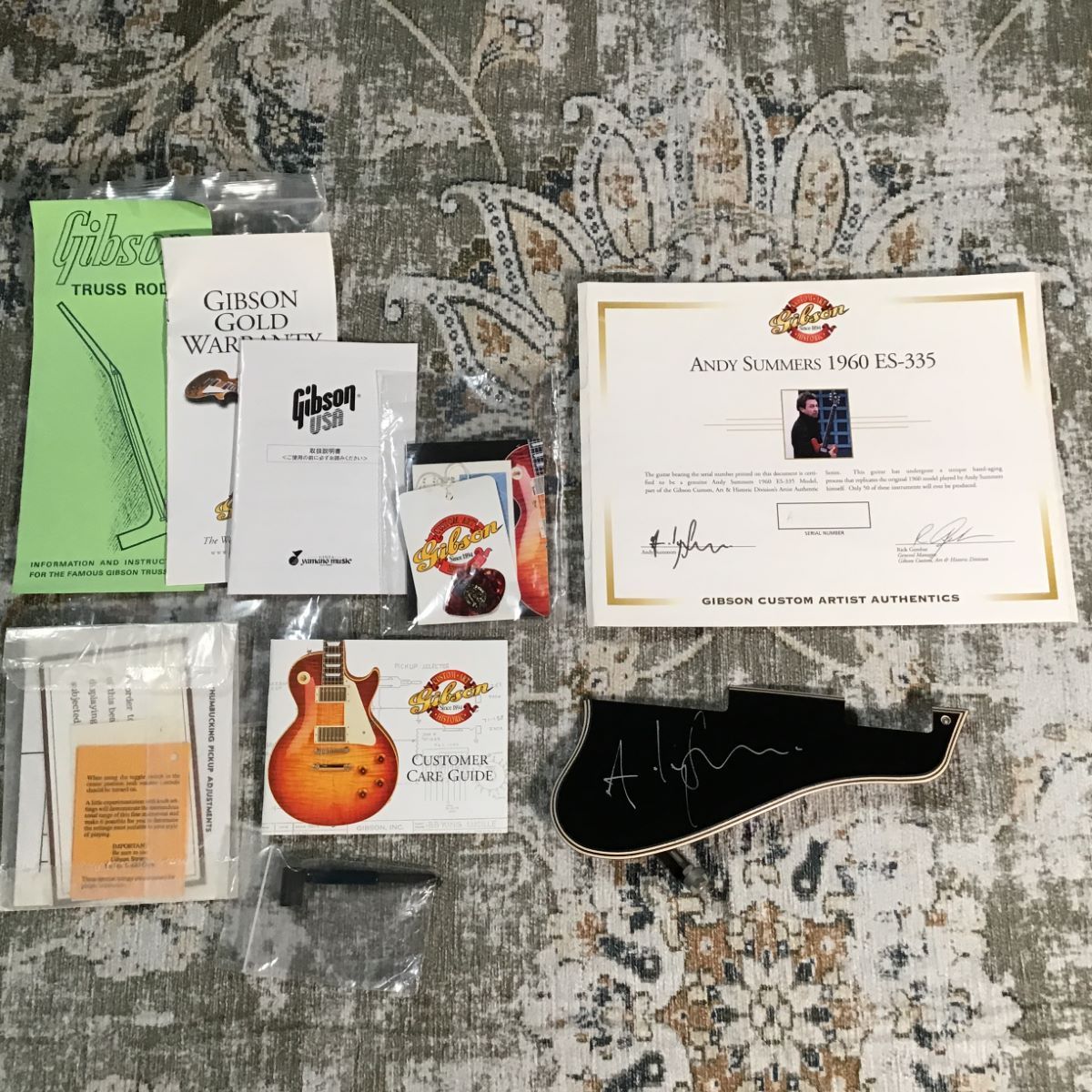 サイン入りの認定証、ピックガードが付属します。また、購入当時の付属品も揃っている状態です。