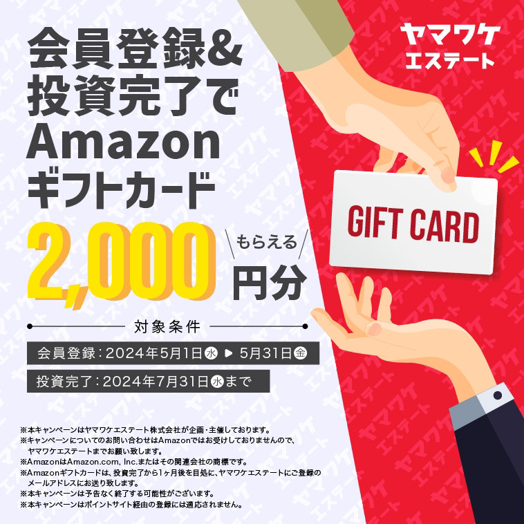 ヤマワケエステートでは現在、新規会員登録と投資完了でAmazonギフト券2,000円分がもらえるキャンペーンを実施しています。(2024年5月時点)