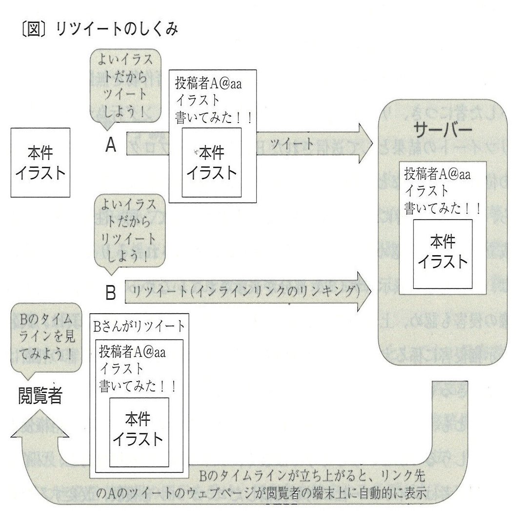 Aが投稿した本件イラストのツイートをBがリツイートすると、Bのタイムライン上に本件イラストが表示される。これは、Bのリツイートにより、BのタイムラインのウェブページにAのツイートの画像ファイルのURLへのインラインリンクが自動的に設定されるためである。インラインリンクとは、ユーザ(Bのタイムラインの閲覧者)の操作を介することなく、リンク元のウェブページ(本件イラストをリツイートしたBのタイムライン)が立ち上がった時に、自動的にリンク先のウェブページの画面またはこれを構成するファイル(Aのツイートの画像ファイルのURL)が当該ユーザの端末に送信されて、リンク先のウェブページがユーザの端末上に自動表示されるように設定されたリンクをいう。