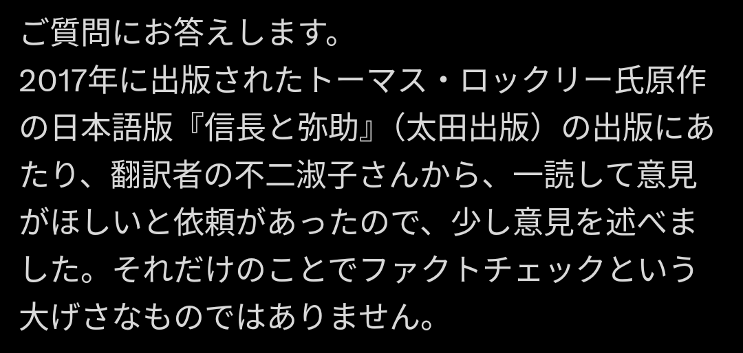 2017年に出版されたトーマス・ロックリー氏原作の日本語版『信長と弥助』(太田出版)の出版にあたり、翻訳者の不二淑子さんから、一読して意見がほしいと依頼があったので、少し意見を述べました。それだけのことでファクトチェックという大げさなものではありません。