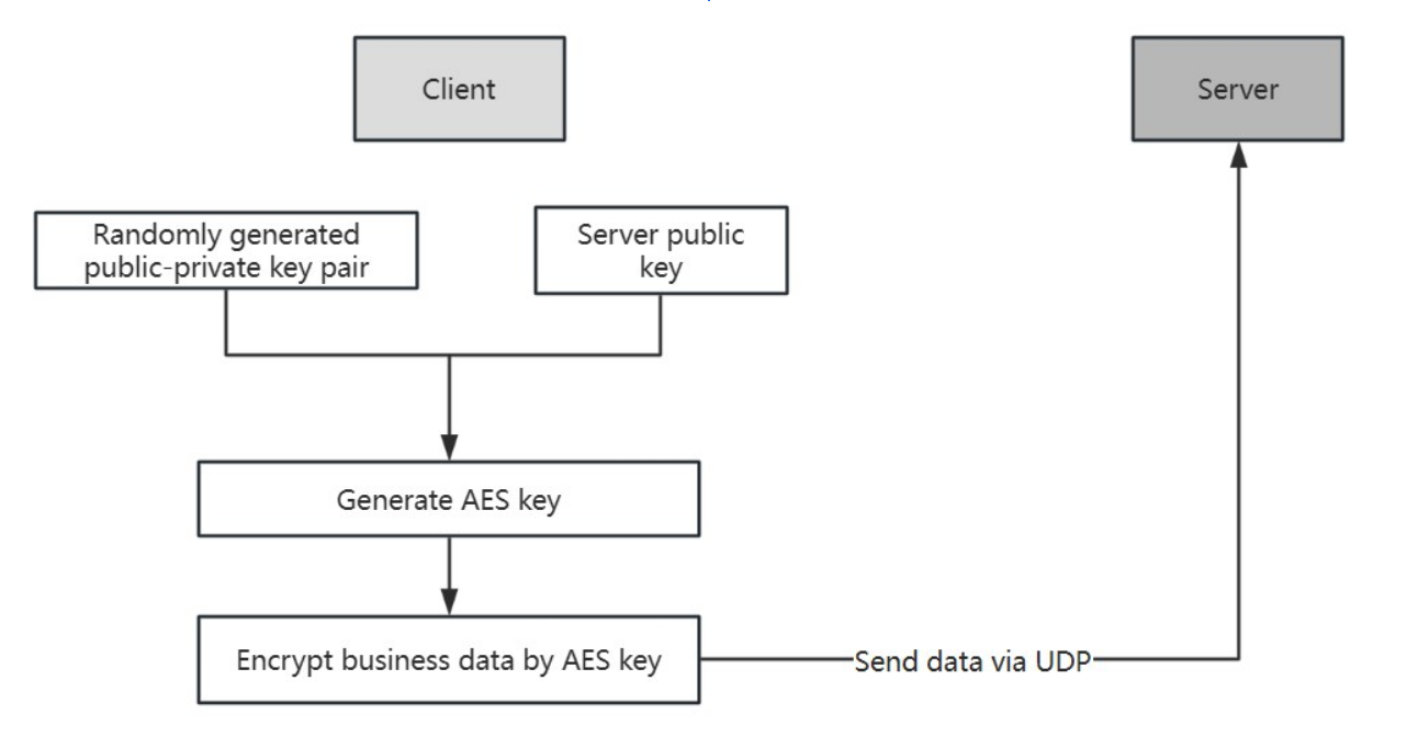 Upon opening the keyboard, before the first outgoing BAIDUv4.0 protocol message is sent, the application randomly generates a client Curve25519 public-private key pair, which we will call (pkc, skc). Then, a Diffie-Hellman shared secret k is generated using skc and a pinned public key pks. To send a message with plaintext P, the application reuses the first 16 bytes of pkc as the initialization vector (IV) for symmetric encryption, and k is used as the symmetric encryption key. The resulting symmetric encryption of P is then sent along with pkc to the server. The server can then obtain the same Diffie-Hellman shared secret k from pkc and sks, the private key corresponding to pks, to decrypt the ciphertext.