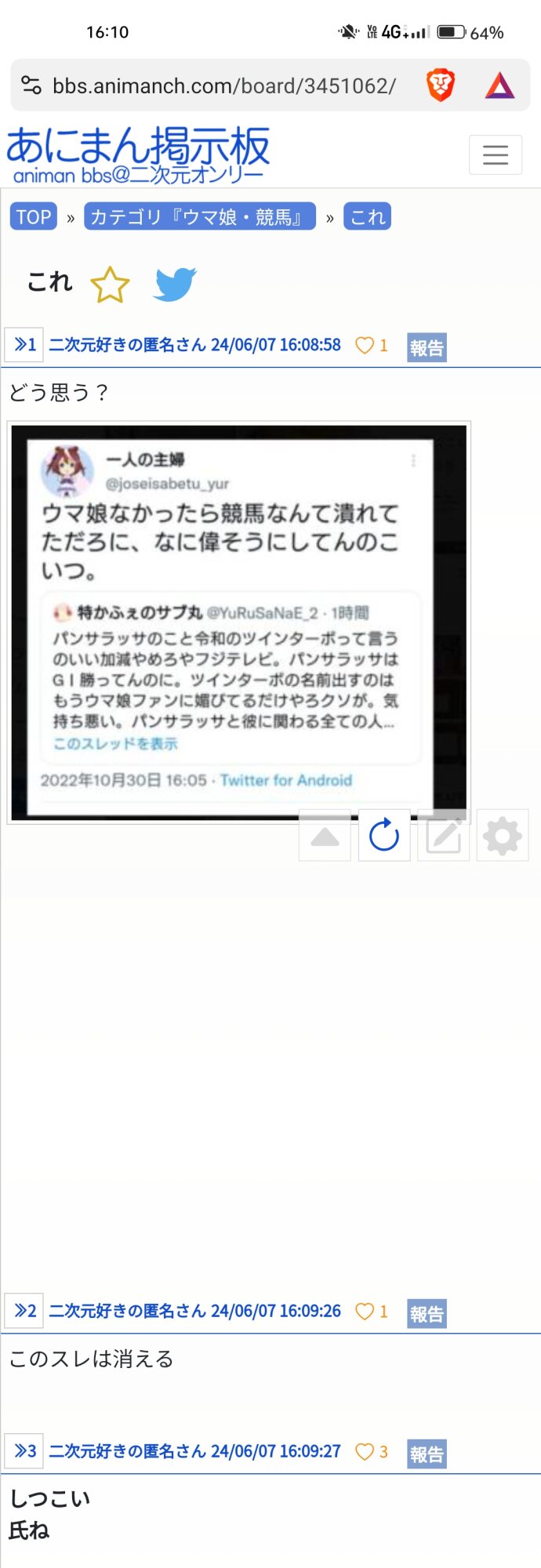 どうせま、また逆ギレして〇夢やらエロ画像スレ乱立か… - 21二次元好きの匿名さん24/06/07(金) 16:32:45