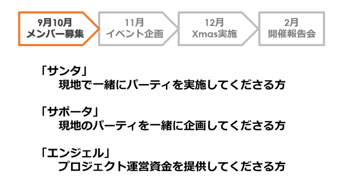 子供達の一生の思い出に残るようなXmasを実現するべく、是非多くの方と一緒に協力していきたいと考えております。ご支援ご協力のほどよろしくお願いいたします。