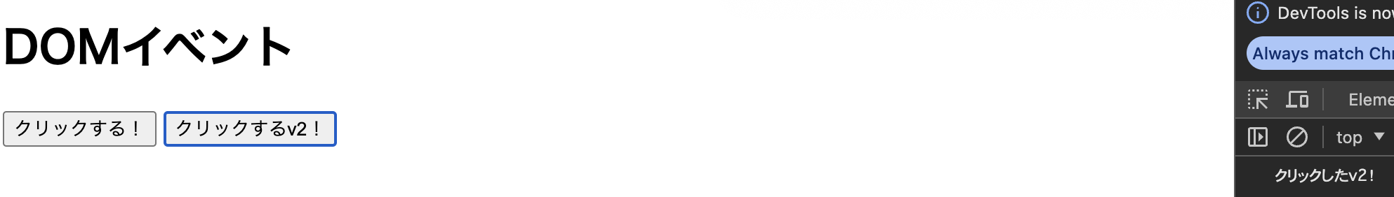 クリックする2!ボタンをクリックすると、console.logのクリックしたv2!が出力されているのを確認できます。
