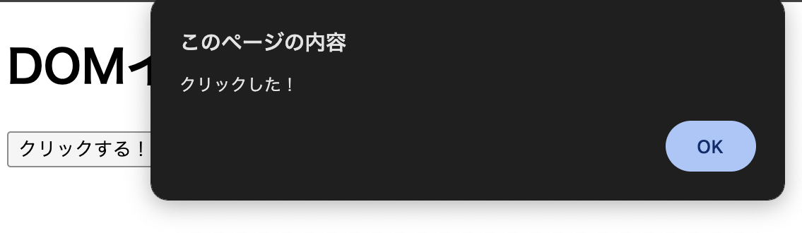 alartの中身として、クリックされたときに、「クリックした!」という文章が表示されます。