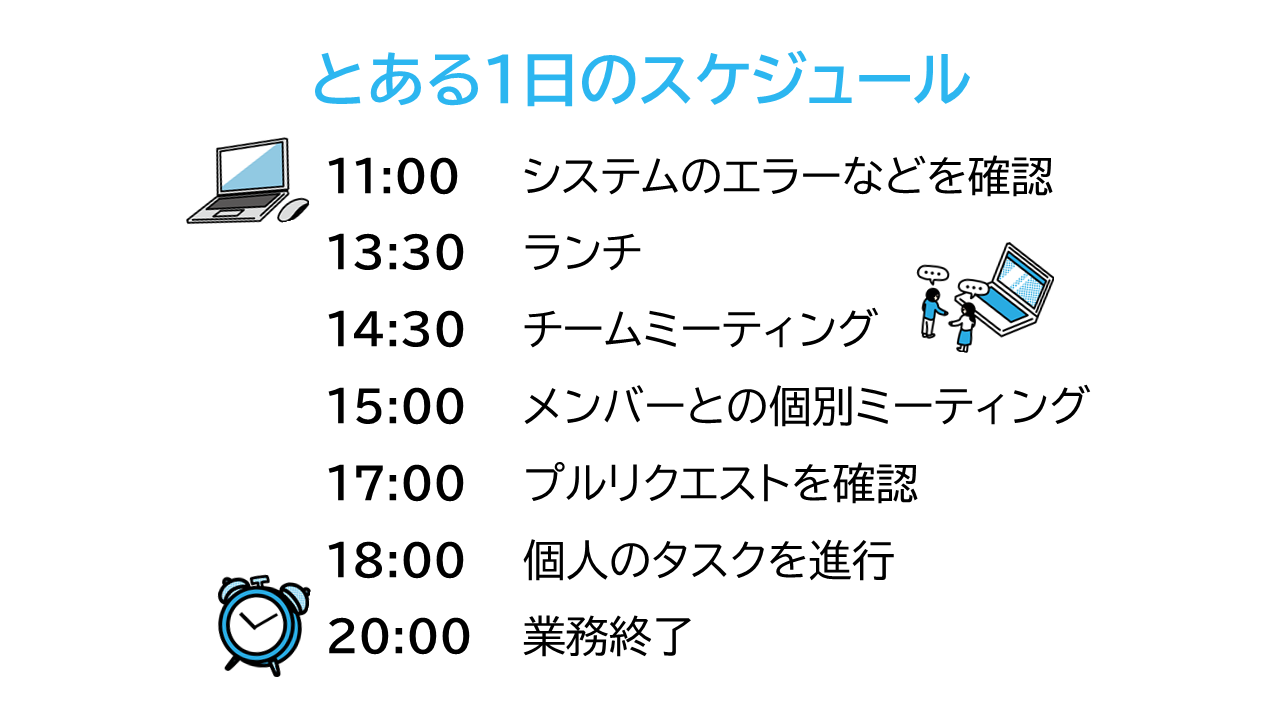業務を開始してすぐに、まずは新着のメールやSlackのメッセージをチェックします。また、夜の間にきているシステムのエラーも確認。新たに対処が必要かもしれないエラーは、メンバーに詳細の確認をお願いします。