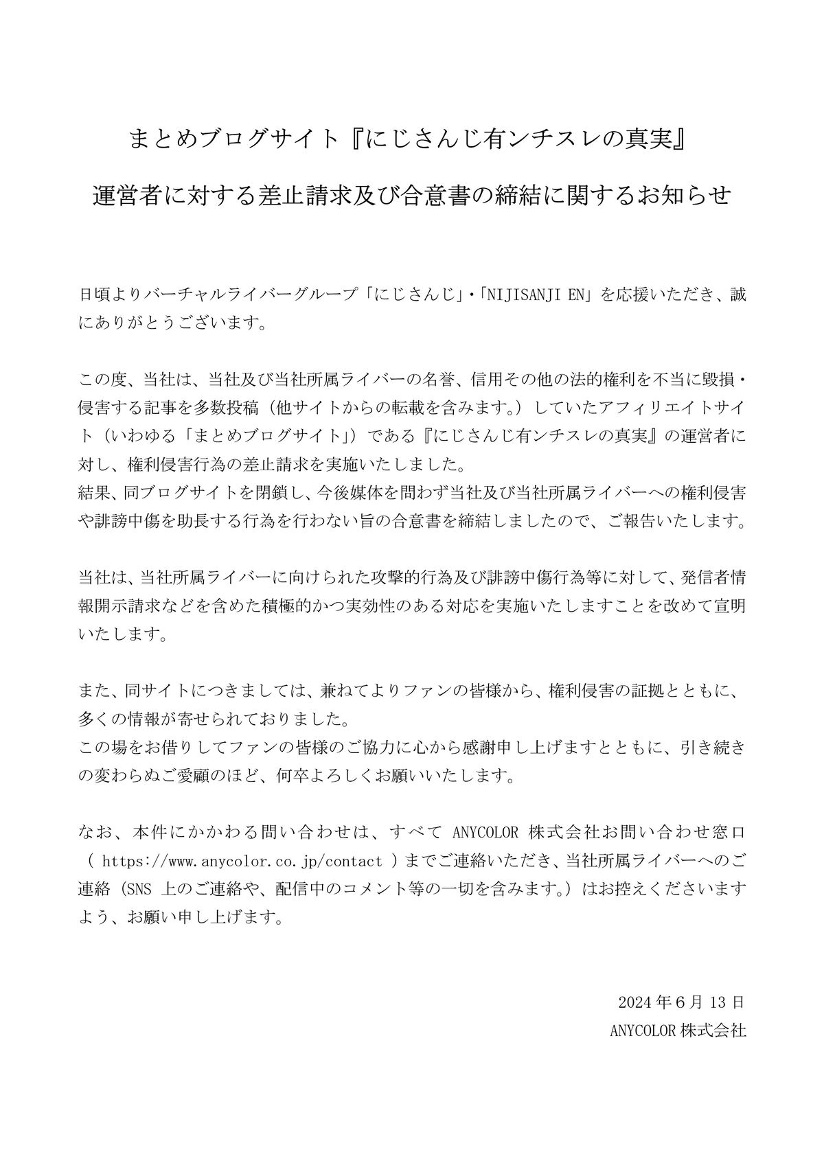 当社及び当社所属ライバーに対する悪質な記事を多数投稿していたまとめブログサイト『にじさんじ有ンチスレの真実』運営者に対し、権利侵害行為の差止請求を実施