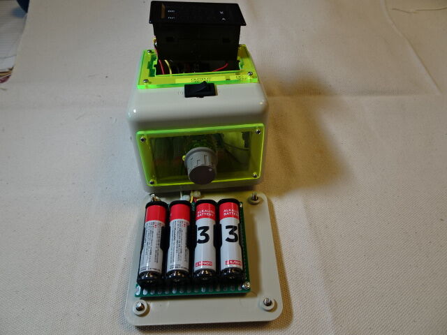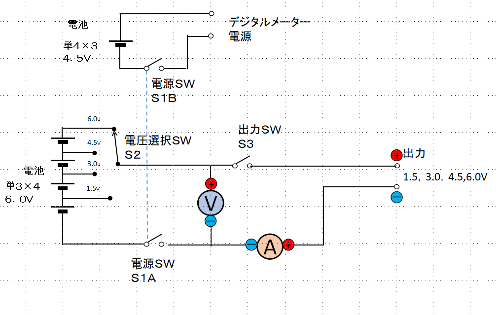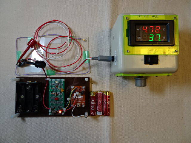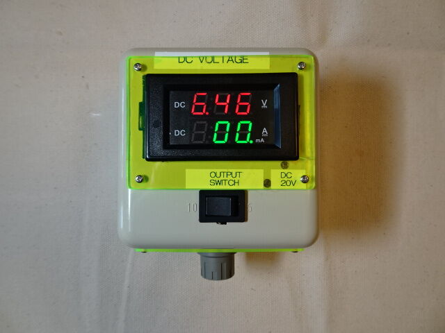 検討を重ねた結果、機能を強化して「供給電圧切り替え機能及び電圧・電流測定機能付き電池式電源」を試作しました。