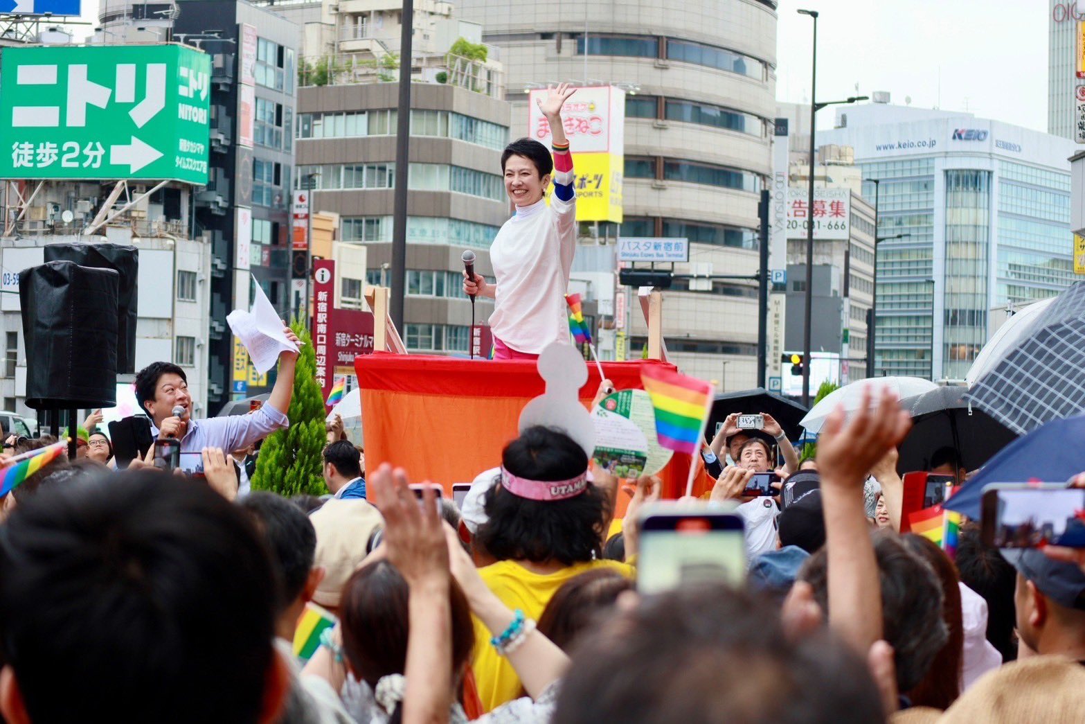 東京都知事選(7月7日投開票)に立候補している蓮舫前参院議員=立憲民主党を離党=が6月30日、JR新宿駅前で「LGBTQ街宣」に参加し、支持を呼び掛けた。LGBTの関連グッズを身に着けた蓮舫氏は「東京からレインボーの道を切り開かないか。いろいろな生き方をフェアに支援する都知事になりたい。それが東京の誇る多様性だと思う」と語った。