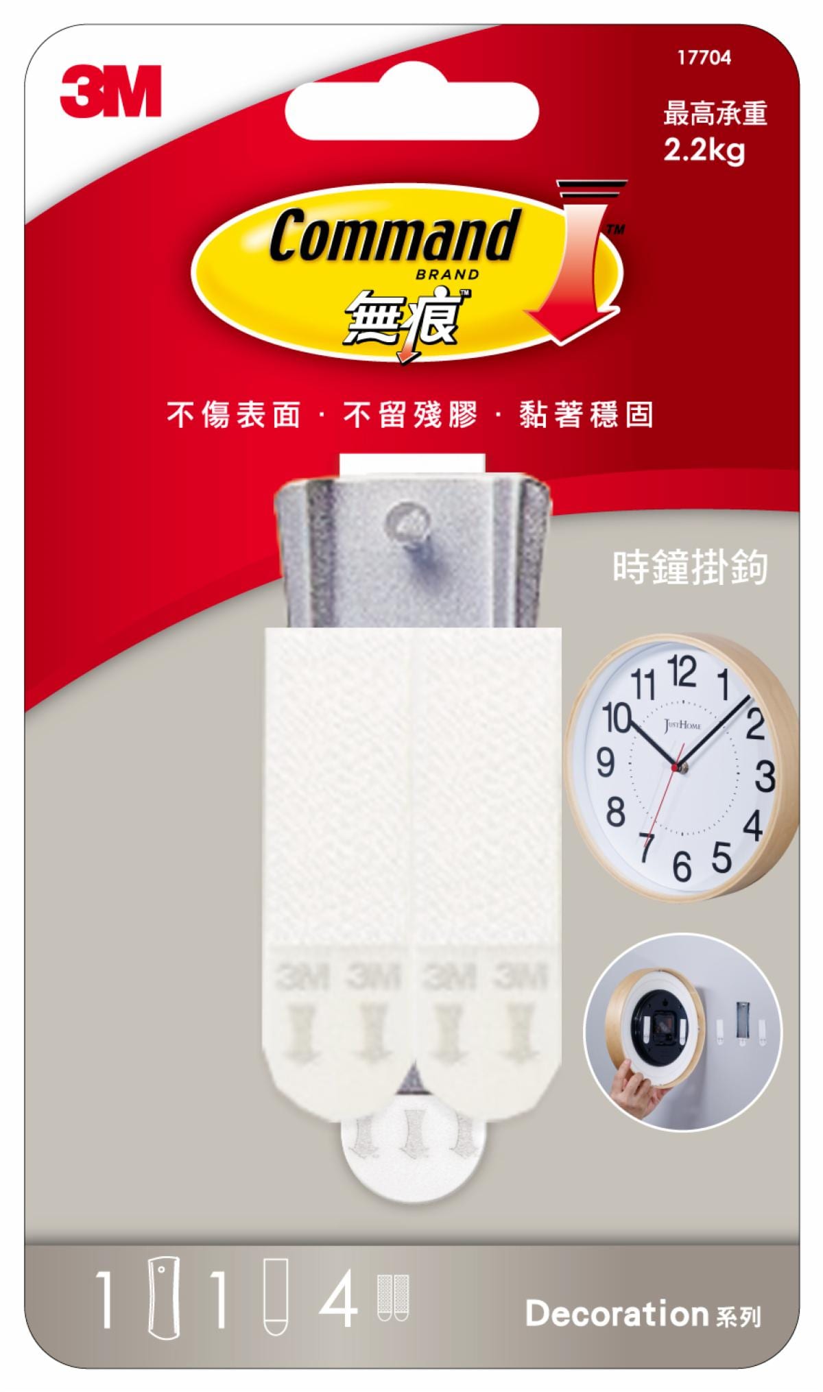 每一支可承重2.2公斤,使用一片無痕大型膠條,輔以兩組小型相畫框掛扣
