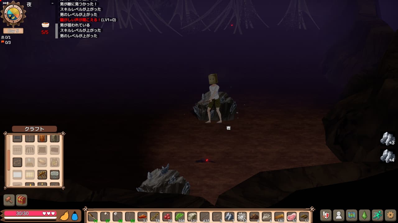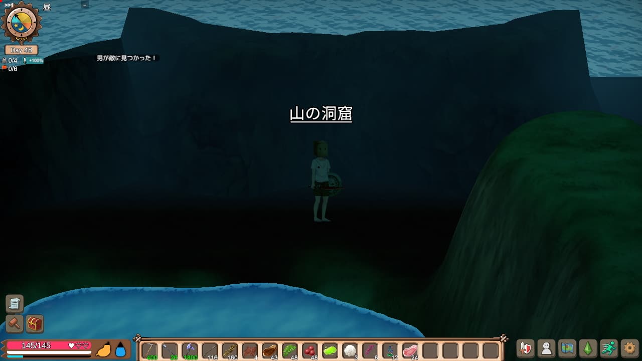 本作特にチュートリアルも目標も示されずいきなり浜辺に放り出されるので色々手を動かしながら慣れていくしかありません。この手のゲームを遊んだことがある方ならば大体最初にやるべきことは分かると思います。採取して作業台建ててクラフト!