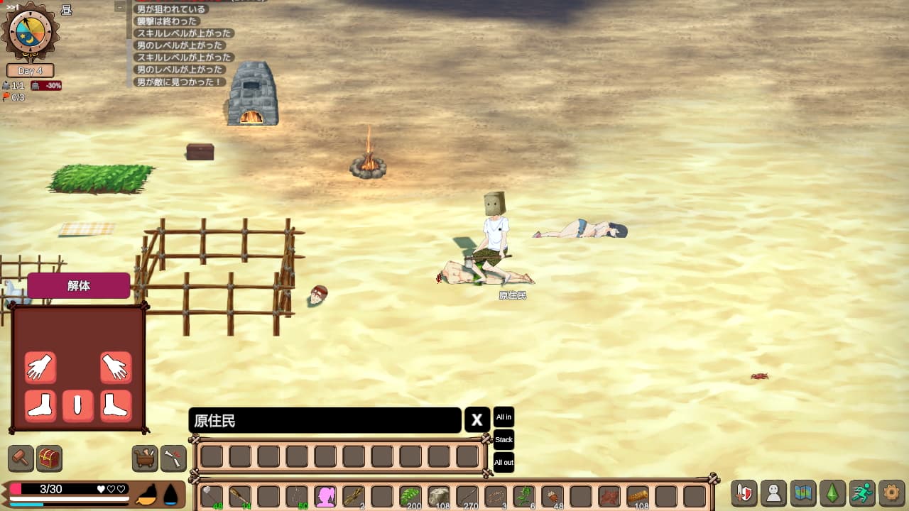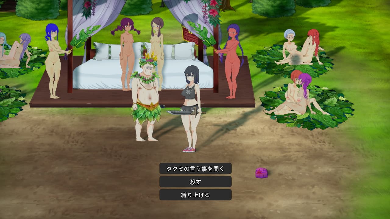 本作異様な点としてはグロ要素ですね(設定で抑えることも可能みたいです)。この島には原住民が居るんですが彼らを解体して飾ったり家具にするなど結構露悪的な要素があり、アニメ調同人ゲームとしてはかなりユニークな方向に力が入っています。