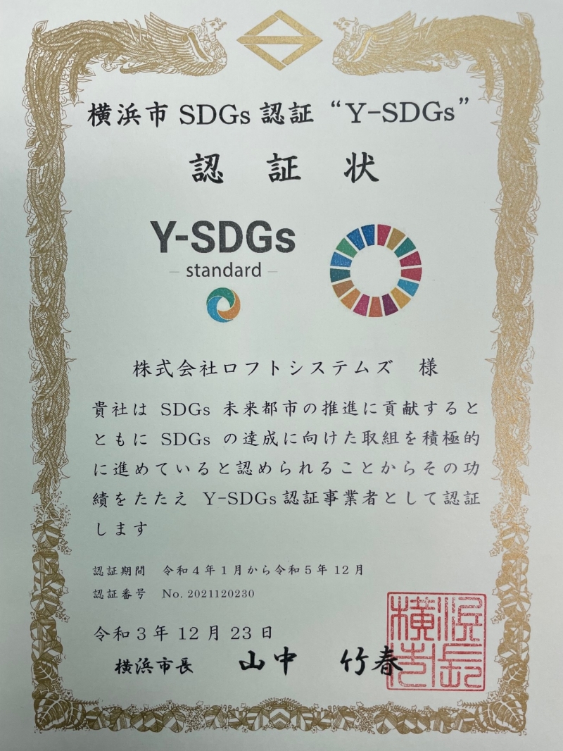 2021.12.23 山中 竹春横浜市長より、SDGsの達成に向けた取り組みを積極的にしている企業として「Y-SDGs認証(スタンダード)」を授与されました。