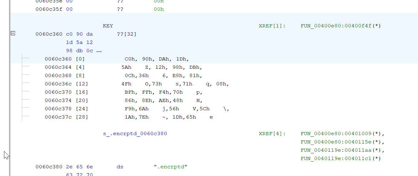 Tidak seperti LockBit yang memakai RSA1024 sebagai master keynya, Babuk memakai ECC curve25519 (256 bit). Karena source code sudah bocor, analisis bisa dilakukan dengan cepat dengan Ghidra ataupun IDA (perkenalan dasar memakai Ghidra dan IDA sudah saya tuliskan di sini). Key ada di alamat 0x0060c360.