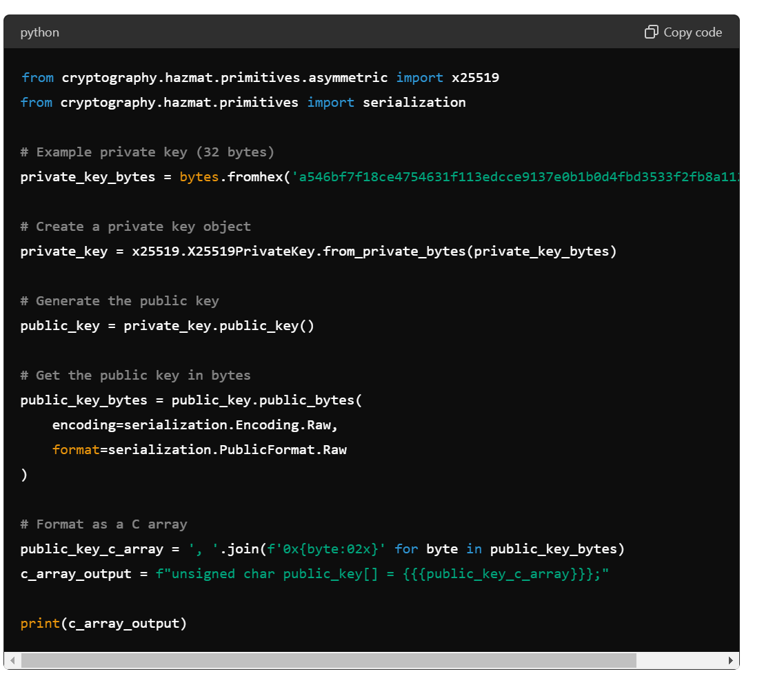 1 2 3 4 5 | static uint8_t m_publ[32] = {0xa9, 0x9c, 0xa8, 0x65, 0x52, 0x00, 0x11, 0x9e,0x5d, 0x86, 0x16,0x57, 0xfa, 0x24, 0x02, 0xb8,0xbd, 0x27, 0xe1, 0xf6, 0x5f, 0xdc, 0xbc, 0x50,0xf0, 0x32, 0xec, 0x1a, 0x56, 0x19, 0x8d, 0x1b}; |