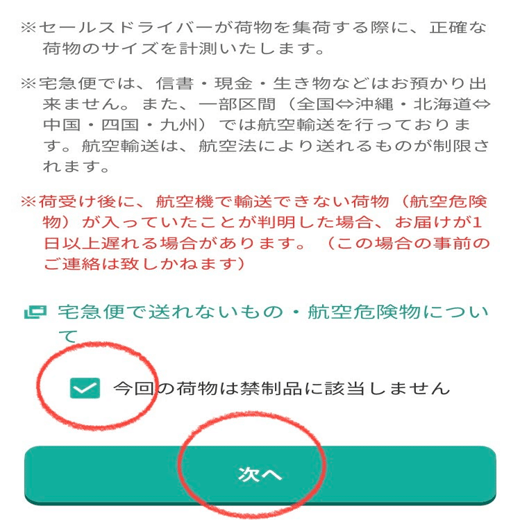 「今回の荷物は禁制品に該当しません」にタップして、チェックをする。 「次へ」をタップ