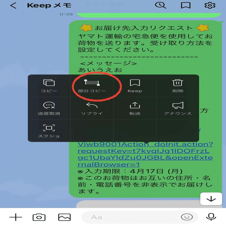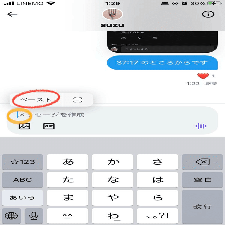 ※コピーのやり方がわからない場合、「あいうえお」のあたりを長押しすると、黒の吹き出しが出てくると思う。