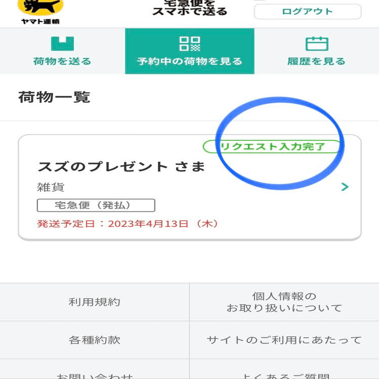 荷物一覧から、「リクエスト入力完了」の表示があれば、
