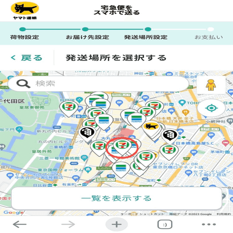 ※以下は、「地図上から選択」の方法 地図が表示されたら、荷物を預けたい場所を地図から探す。
