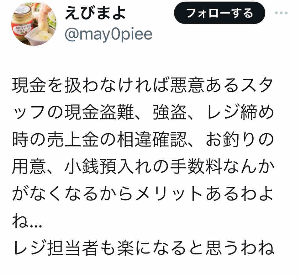 ・現金をほとんど扱わなくなったおかげで、レジ締めが早く済むし、銀行にも行かないので、時間が節約できている。