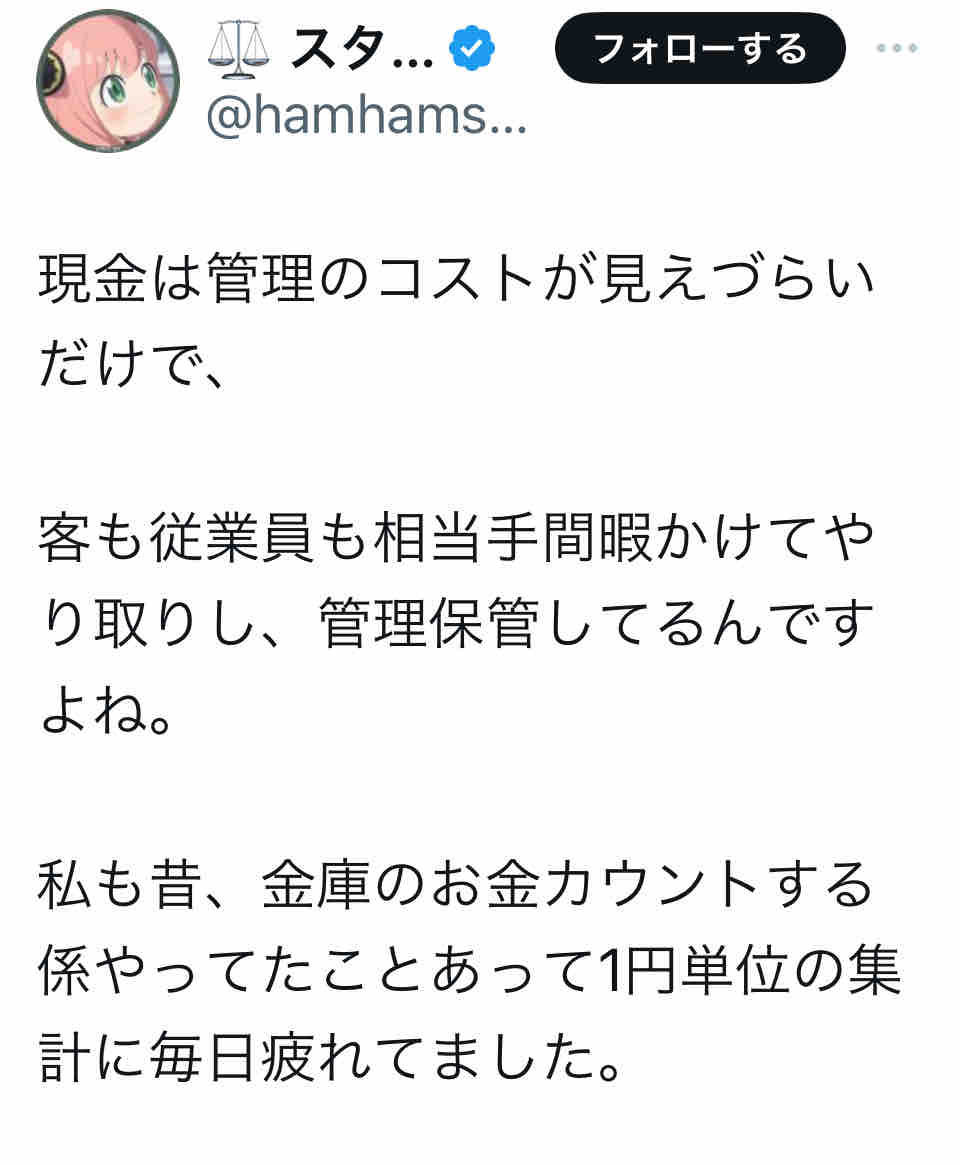 このポストに対して賛同する意見がある一方で、私のように、現金の管理コストに言及する意見も目立ちました。
