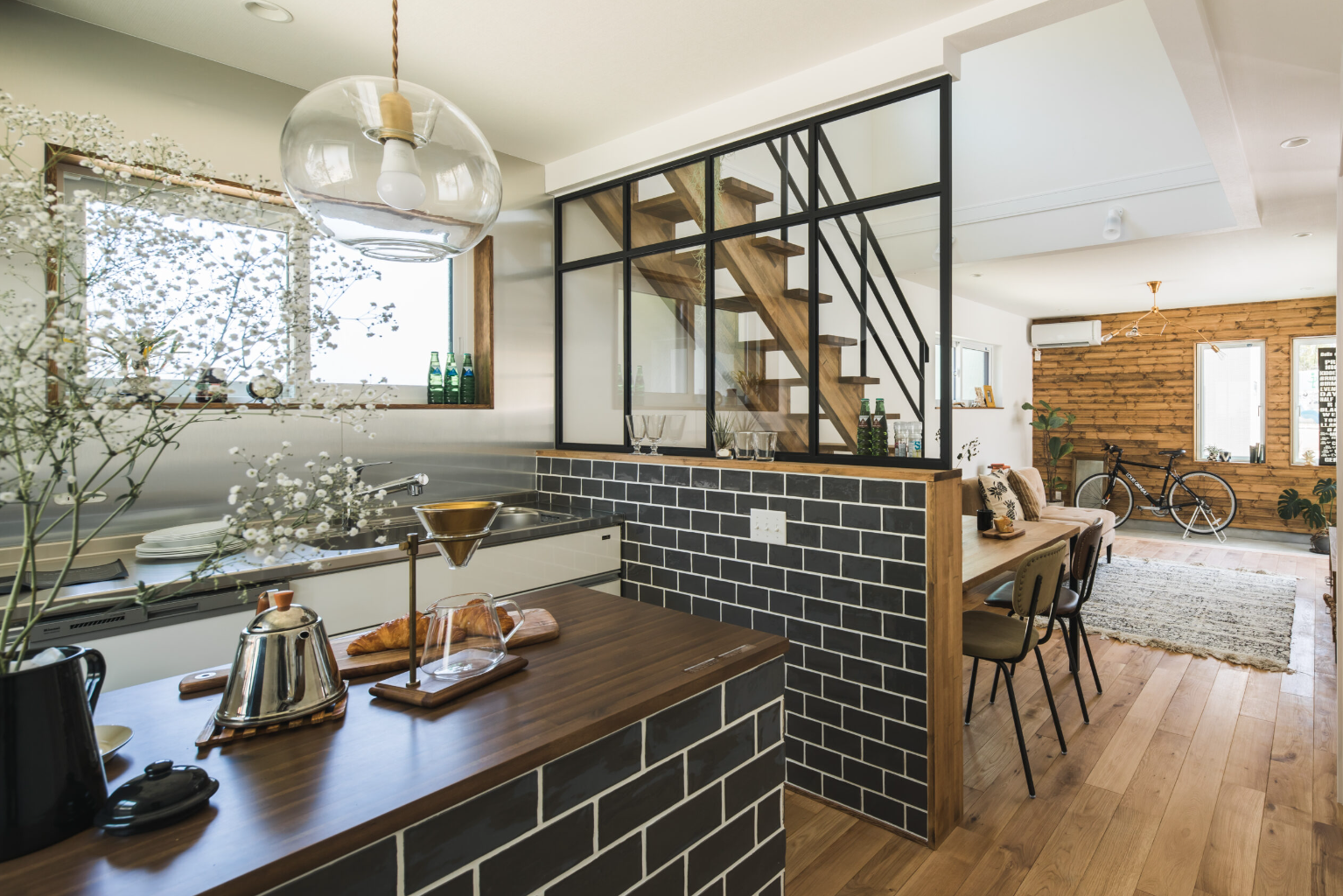 黒のタイルが印象的なこちらの家は、オシャレなアメリカンスタイルの生活ができる空間になっています。吹き抜けの天井のおかげでとても開放感があり、明るさもしっかり確保。