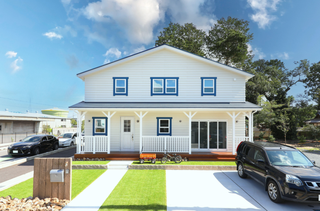 まるで海外に来たかのような外観に、心踊る方も少なくないでしょう。真っ白なカリフォルニアスタイルの家は、窓枠のブルーのアクセントが効いた明るい印象の家です。