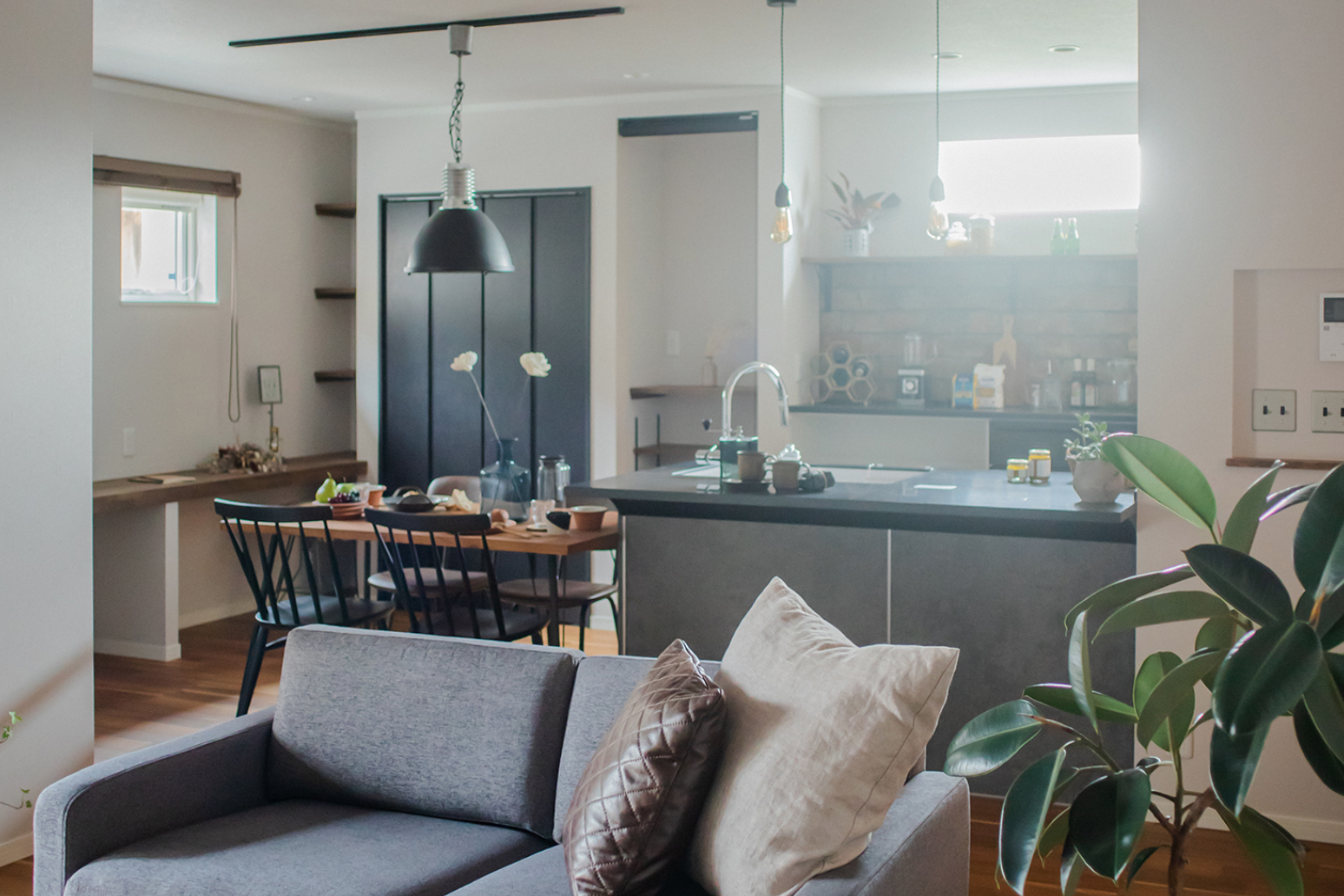 室内も全体的に落ち着いた印象で、品の良さを感じさせる空間になっています。白・グレー・黒をベースとしているため、色のある家具でも、植物でも、なんでも合わせられます。