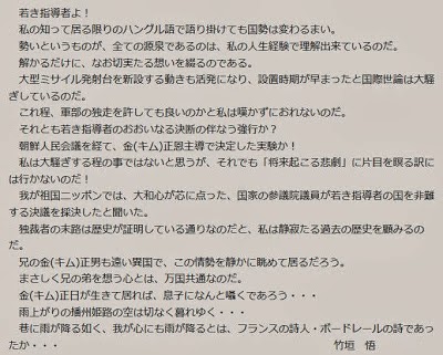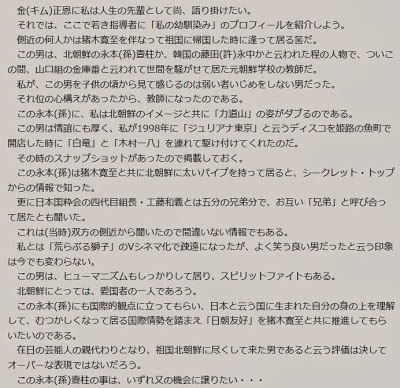 北朝鮮にとっては、愛国者の一人であろう。この永本(孫)にも国際的観点に立ってもらい、日本と云う国に生まれた自分の身の上を理解して、むつかしくなって居る国際情勢を踏まえ「日朝友好」を猪木寛至と共に推進してもらいたいのである。