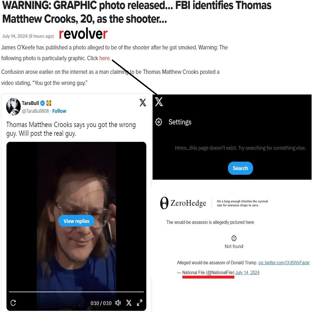 2 つ目の質問は、昨日メディアで取り上げられた、死亡したとされるトーマス・マシュー・クルックスの「生々しい画像」がなぜ今消えてしまったのかということです。私が上に載せた画像 (左側) は、今日でもまだ見つけることができた唯一の画像です。