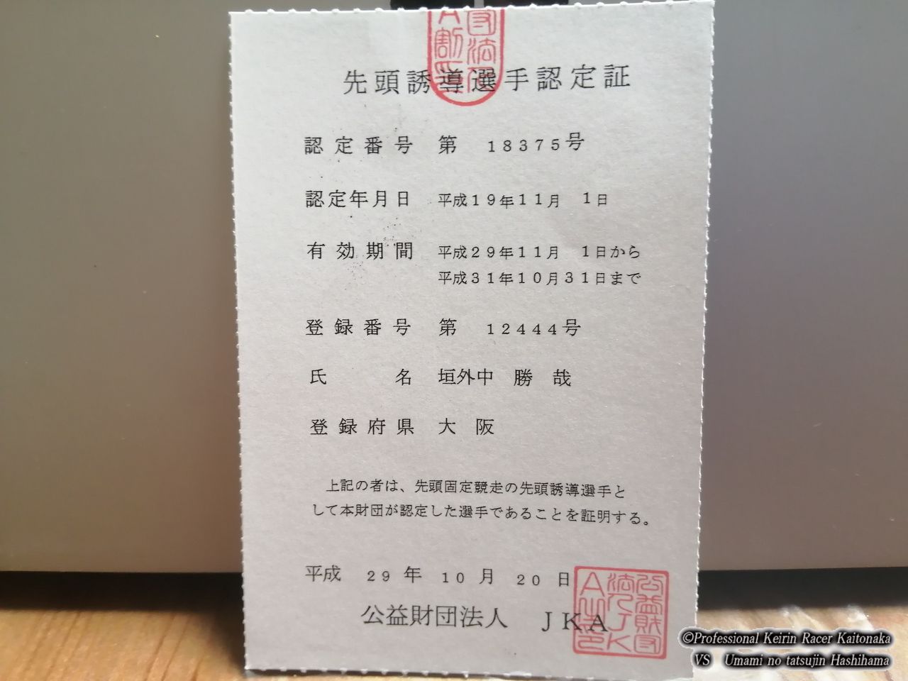 先頭誘導選手認定証