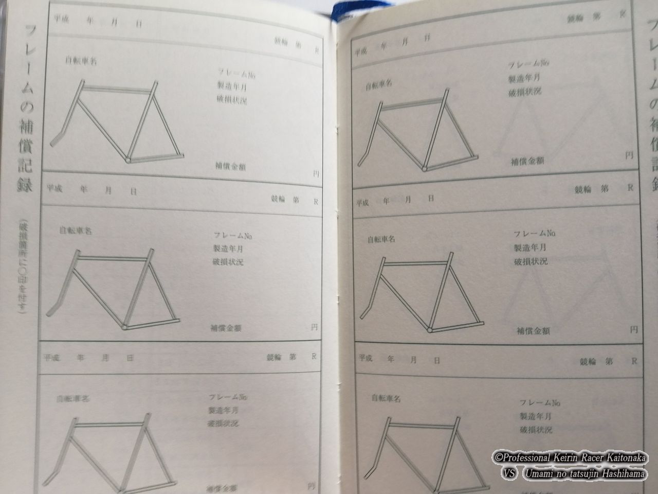 次の項目は競走で落車した時の、フレームの破損補償を記録しておく「フレームの補償記録」です。